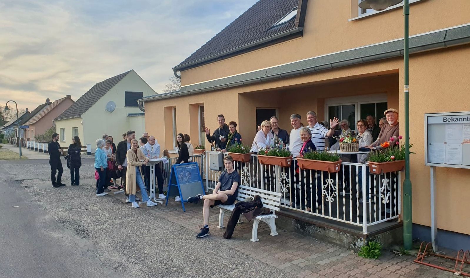 An einem der seltenen sonnigen und warmen Abenden im April in Michelsdorf. Vor dem Gemeindezentrum an der Rädeler Straße sind Stehtische verteilt. Auf ihnen stehen Vasen mit blühenden Kirschzweigen. Die Tische sind umringt von kleinen Gruppen im entspannten Gespräch. Sie genießen den Sonnenuntergang und ihren „Sundowner“.