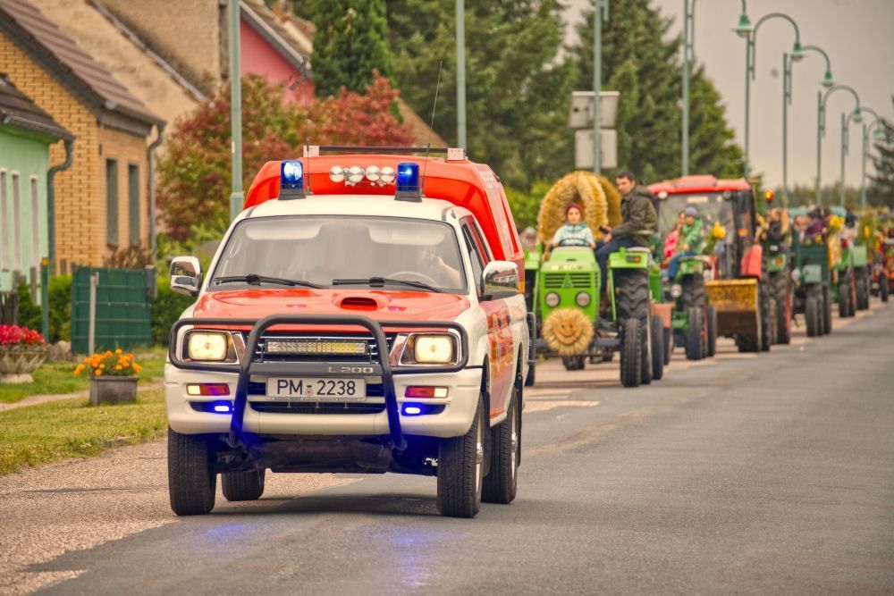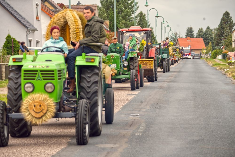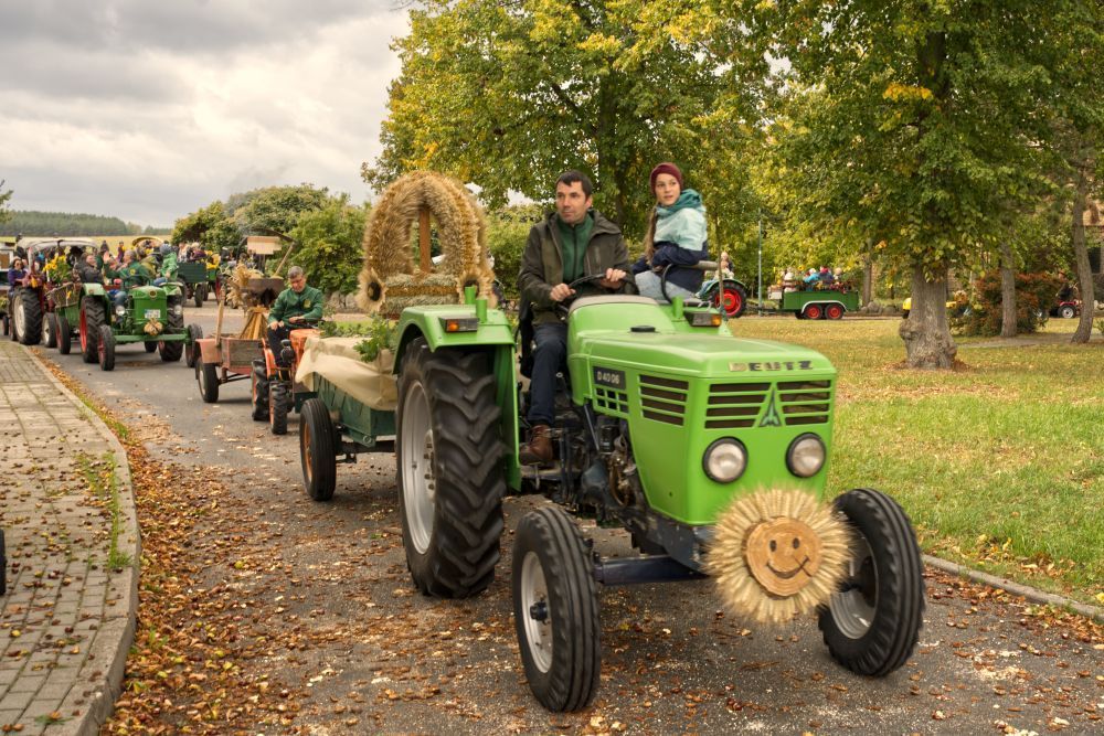 Pünktlich knatterten die Traktoren mit ihren geschmückten Wagen aus ihren Höfen Richtung Dorfplatz. Pferdegeklapper mischte sich ein. Besuchergruppen gesellten sich zu dem bunten Zug. Ein Traktor musste gemeinsam angeschoben werden. Die Feuerwehrautos stellten sich mit Blaulicht auf. Kurz, die Spannung wuchs. Und endlich bewegte sich der Zug - immer der Erntekrone nach - durch die Dorfstraßen zur Michaelskirche. Erfreulich viele Besucher wohnten dem Gottesdienst bei. Der hiesige Männergesangverein begleitete musikalisch die Messe und wurde mit viel Beifall belohnt. Am Schluss verteilte Frau Pfarrerin Wisch symbolisch Brot und Trauben.