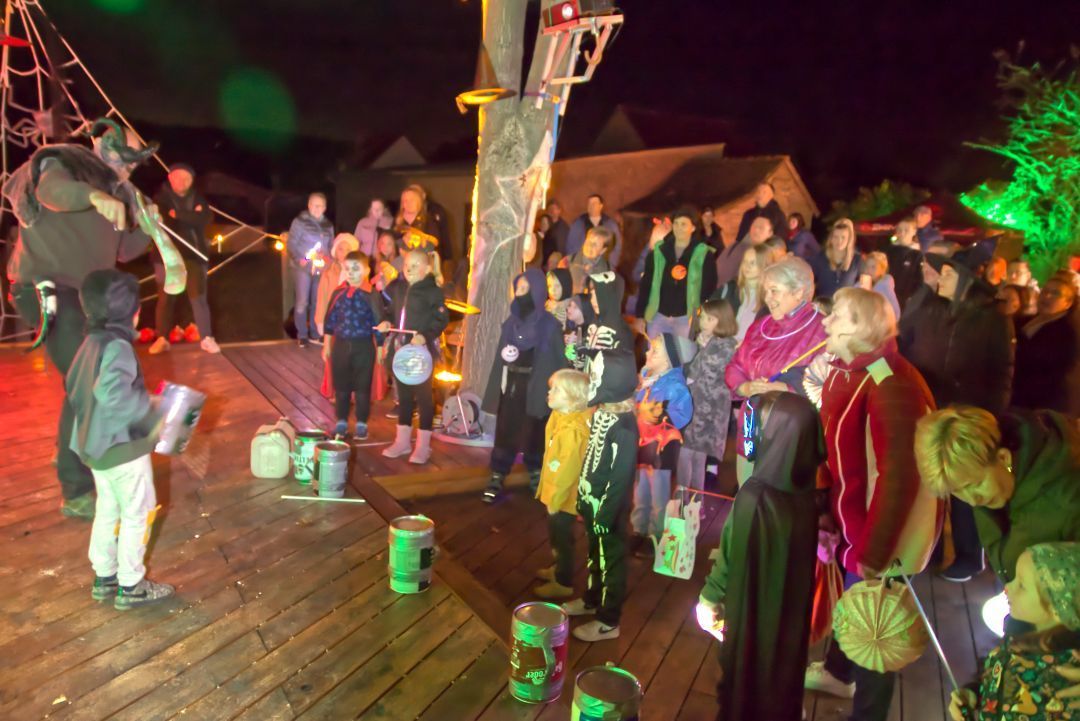 Die Herberge füllte sich. Offizielle Stellen des Kultur- und Geistervereins sprechen von über 150 Seelen. Mit dieser Power sollte es doch zu schaffen sein: das Vertreiben der bösen Geister aus Michelsdorf! Eine Aufgabe der TheaterGäng des Vereins. Der „Große“ aus der Truppe rief mit seinem Wikingerhorn die jungen Geistervertreiber zu einer Stammesversammlung ein. Trommeln, Rasseln und Pfeifen wurden verteilt, die rhythmischen Geräuschkulissen abgesprochen. Sie sollten dafür sorgen, das Böse aus dem Dorf zu vergraulen.