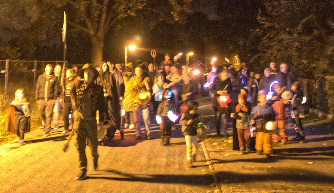 Der Wikinger (oder Ziegenbock?), der Tambourmajor und die zwei Geistertrommler bildeten die Spitze des Zuges. Letztere sorgten mit ihren Schallwellen (mehr oder weniger erfolgreich), für eine für Körper und Geist erträgliche rhythmische Harmonie. Denn es ging ziemlich zur Sache. „Wenn auch weniger musikalisch, aber an Dezibel gemessen eine gründliche Leistung…“ bescheinigte ein Elternteil die Vergraulungsaktion. Wenn der Geisterzug auch durch relativ wenige Straßenzüge durchging, „…das war bis zum letzten Hühnerstall des Dorfes zu hören!“.