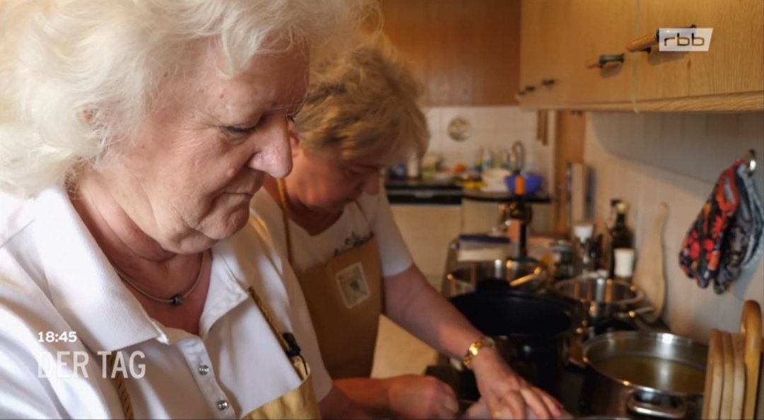 Die zündende Idee war: Wir zeigen unseren Fernsehauftritt vom 13.06.2024 im RBB. Die Sendung „DER TAG“ hat ihre Serie „Topfgucker“ in Michelsdorf drehen lassen. Hauptakteure sind Marianne Bade, Friedlinde Schinhauer und Katja Leichsenring. Gesagt, getan. Besser aber war hinterher das Zeigen der alten Fotos, der sogenannten “Kochfrauen“ und “Kiekeweiber“. Viele Namen und Erinnerungen wurden rausgekramt.