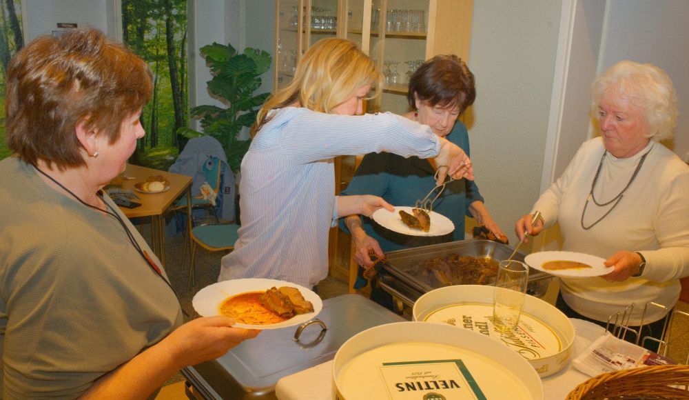Da ist professionelles Sponsoring angesagt. Zum diesjährigen Weihnachtstreff wurde - im wahrsten Sinne des Wortes - der Vogel abgeschossen: So zog Jäger Volker Konietzko in den Klosterwald, um für die Renter:innen Wild zu jagen: Frischer Reh- und Wildschweinbraten - wann gibt es das schon mal? Und Landtagsabgeordneter Udo Wernitz tauschte sein „Politbüro“ mit dem heimischen Herd aus und spendierte zwei Sahnetorten. Er kann es noch, der Bäckermeister!